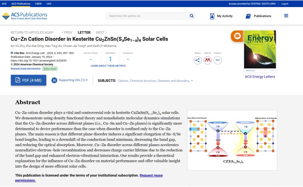 近日,公司童传佳特聘副教授带领本科生团队在JCR 1区国际高水平期刊ACS Energy Letters(IF=22)发表题为《Cu−Zn Cation Disorder in Kesterite Cu2ZnSn(SxSe1−x)4 Solar Cells》的原创论文(https://pubs.acs.org/doi/abs/10.1021/acsenergylett.3c02653)。伟德国际1946官网为第一单位,两位20级本科生朱安宇与丁瑞雪为共同一作,22级本科生徐颢庭为参与作者,童传佳副教授为唯一通讯作者。