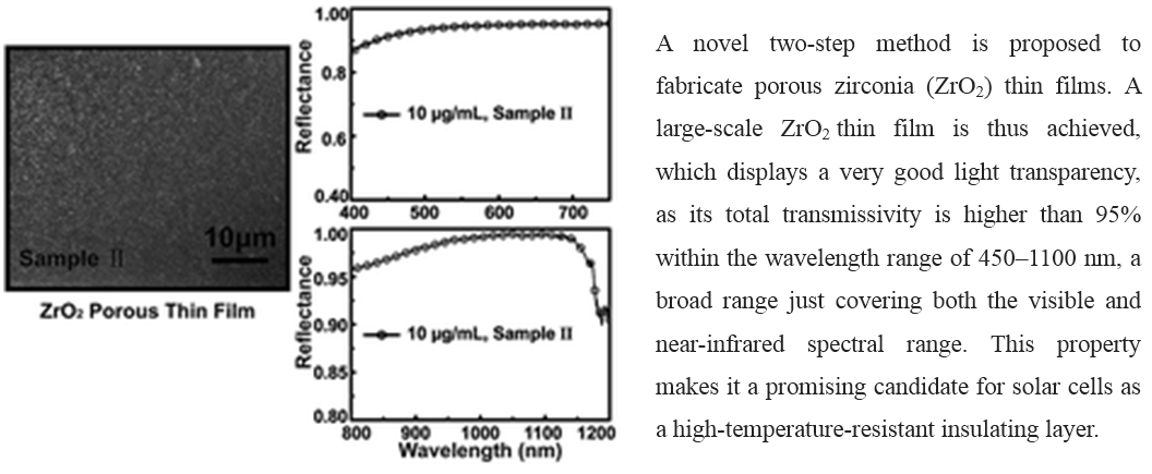 近日,公司欧阳方平教授课题组在多孔ZrO2及透明薄膜制备等方面的研究取得新进展,报道了一种高比表面积(≥162 m2·g-1)多孔ZrO2及其透明薄膜(可见-红外区域透过率大于95%)的制备方法与光学性质,此研究成果发表在国际学术期刊RSC Advances。公司本科生应物11级李奥林、应物12级李怡格、光电13级李俊飞同学在陈羽老师和欧阳方平老师的指导下分担了研究中的实验制备、性能测试与计算模拟工作。并发表论文:Yu Chen*, Aolin Li, Yige Li, Junfei Li, Guo Zhang Dai, Fangping Ouyang*, Xiang Xiong, “High Transparent Porous ZrO2 Thin Films: Fabrication And Optical Properties”, RSC Adv., 2015(5) : 35929-35933, IF=3.708。
