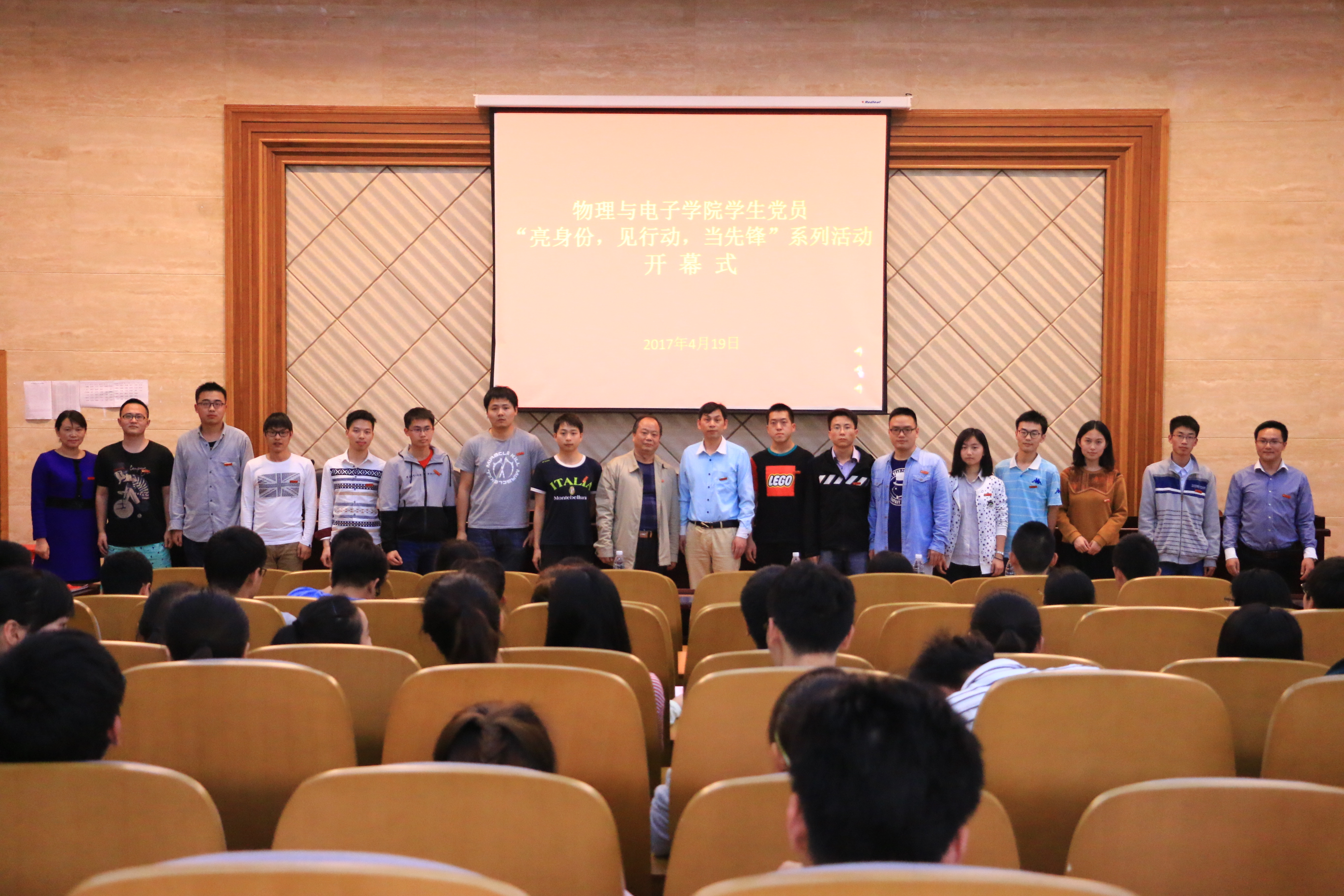 4月19日下午15:00,物理与电子公司员工党员“亮身份,见行动,当先锋”系列活动开幕式在物理楼116报告厅隆重举行。物电公司党委书记许宏武、党委副书记谢群、党委委员兼组织干事申友桂、各年级辅导员以及全体员工党员共150余人参加了开幕式。