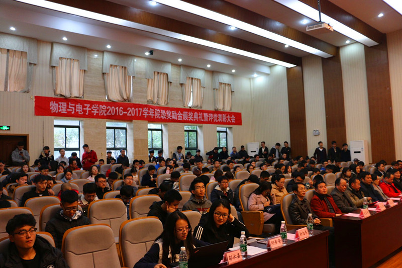 11月22日下午,物理与电子公司2017年院级奖励金颁奖典礼暨评优表彰大会在新校区物理楼116召开。联民药业董事长颜联民,顺康药业董事长赵品高、肖巧芬夫妇,公司党委书记许宏武,副经理李长庚、孙克辉、邓宏贵、徐富新,全体辅导员,获奖员工及各班员工代表参加大会,会议由学工办副主任钟旭东主持。