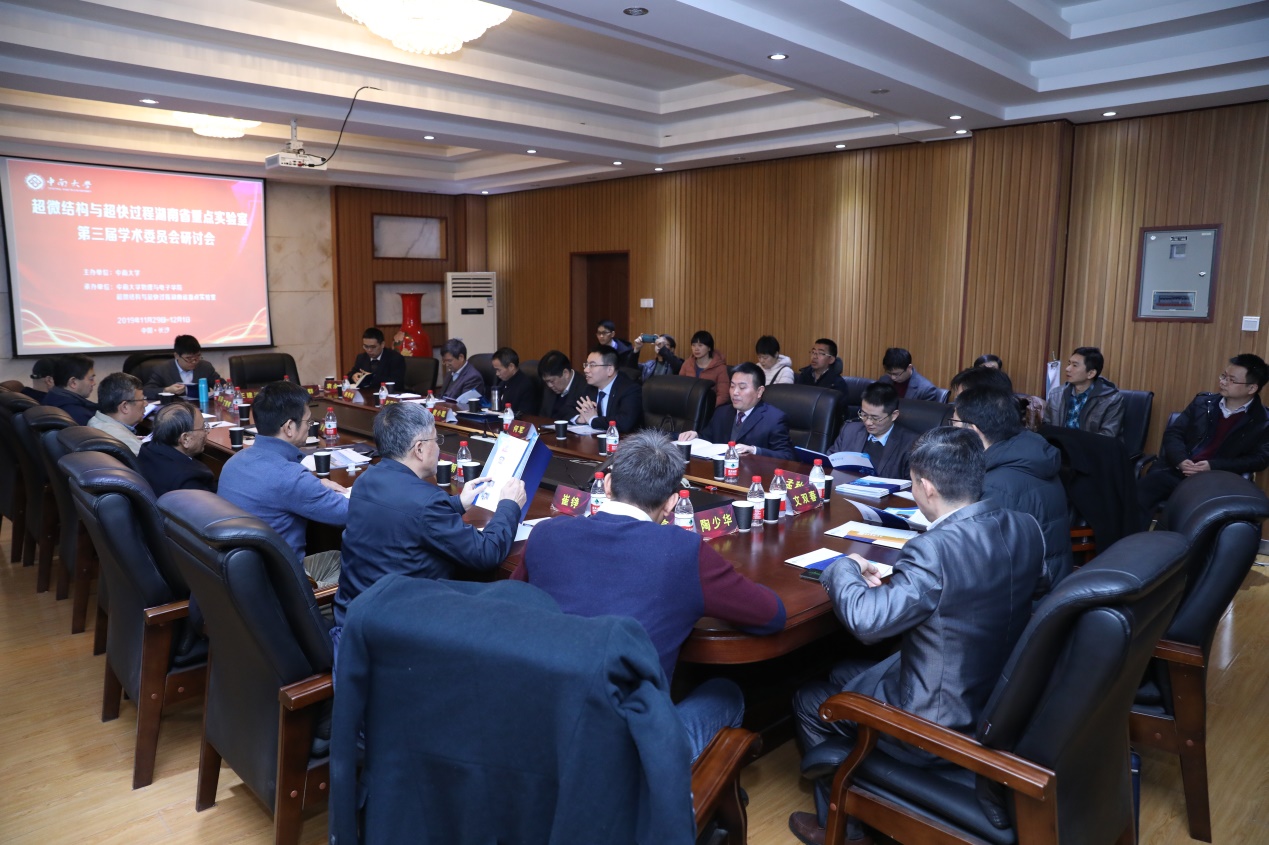 会议开幕式由周科朝副董事长致欢迎辞,并为第三届学术委员会委员颁授聘书。然后由物理与电子公司经理孙克辉教授介绍物理与电子公司的学科专业沿革、团队队伍、学科发展现状,详细介绍了超微结构与超快过程实验室在队伍建设、平台建设、科学研究方面的进展情况。在工作汇报环节,黄寒、阳军亮、陶少华、龙孟秋四位教授分别代表表面研究室、器件研究室、光学研究室、理论研究室做近几年发展报告,内容包括研究项目、科研平台、科研设备与代表性成果等方面。随后,全体与会成员合影留念。