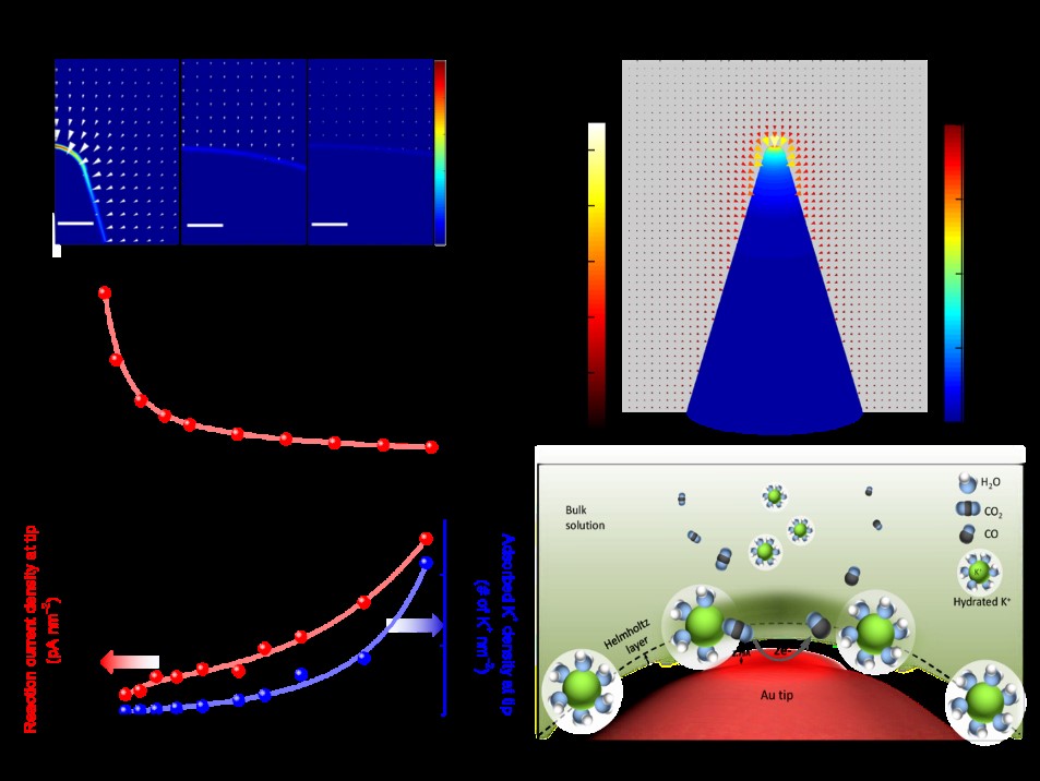 以场致反应物浓度机制为导向,研究团队发展了一种金属纳米针尖的电沉积合成方法。在尖端放电机制作用下,施加超低的过电位即可在纳米针尖的尖端形成局域电场,从而使得电解质中的阳离子在尖端富集,同时提高CO2在尖端的浓度,极大地提高了电子的利用效率和CO2的转换效率,最终实现了三大突破:CO2还原电催化剂性能的大幅提升;CO2浓度在溶液中浓度极大增加;电子利用和转换效率得到极大提高。