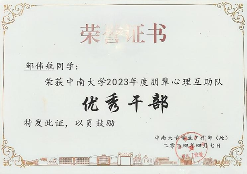 升入大学,邹伟航毅然加入了隶属于伟德国际1946官网党委的伟德国际1946官网员工心理联合会,同时他也担任了公司应物2201班的心理委员一职。任职心理委员的两年期间他报名参加校心理中心组织的“朋辈互助,心晴护航”主题心委培训,选修并高分通过了心理学与生活的公选课。两年里他累计完成公司半月报工作32次,每半月访谈班级两至三名同学心理工作近况,并以问卷的形式统计班级每名同学的心理健康状况,心理访谈工作已覆盖班级全部34名员工,至今有丰富的心委工作经历。