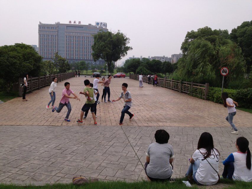 四点钟,剩下的队伍二三结盟,在D座后的草坪开始了直接对决。被淘汰的选手坐在草坪高处,不时为“多对一的围攻、最后关头的反水偷袭”等精彩时刻叫好,直呼精彩。直到最后为了避免更加激烈的争斗,最后两名对决的男生握手言和,宣告了这场“友谊第一”的比赛结束。
