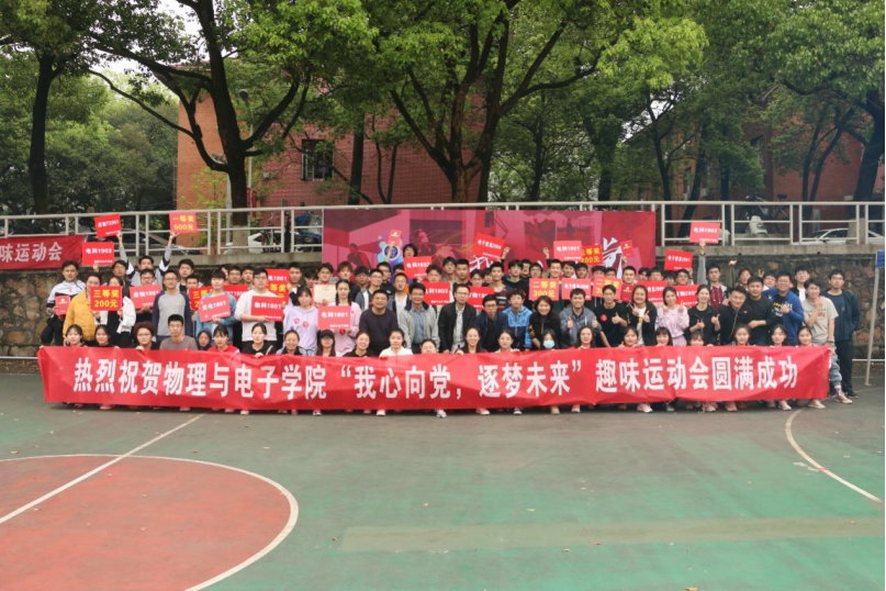 4月17日下午,物理与电子公司“我心向党,逐梦未来”趣味运动会在南校区篮球场顺利举行。党委副书记谢群,班导师,辅导员与400余名本科生、研究生一同参与了此次活动。