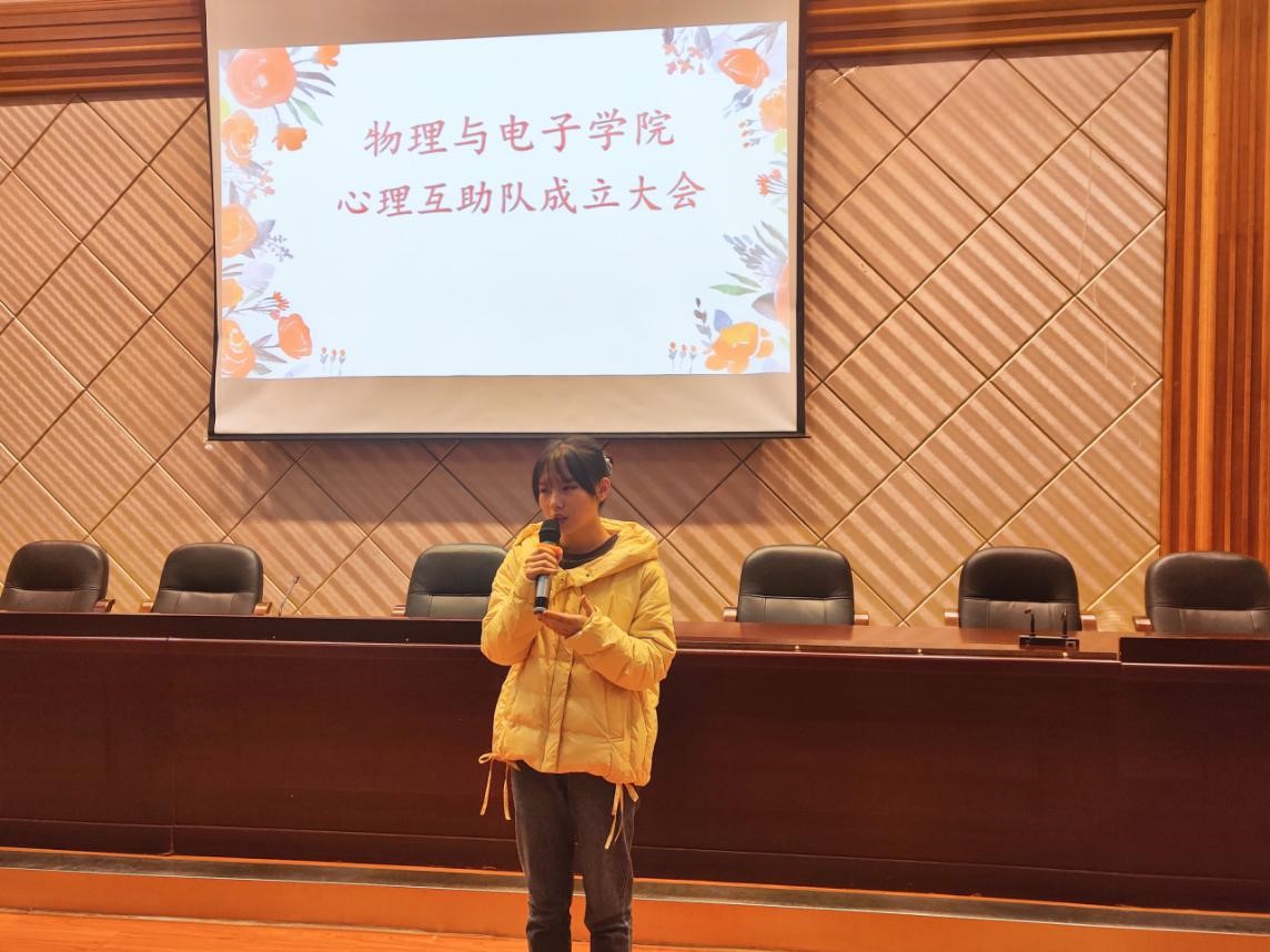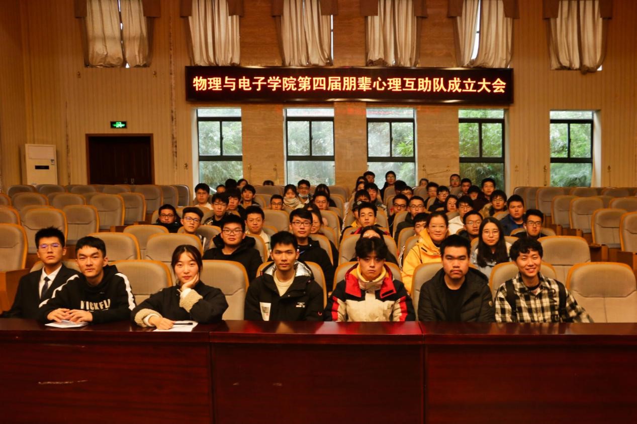 为了更好地解决老员工的心理问题,为当代老员工心理健康保驾护航,同时发扬公司的优秀传统。物理与电子公司朋辈心理互助协会于11月25日下午2点在物理楼116报告厅召开了心理互助队成立大会。会议由廖广昕同学主持,心助会会长及全体成员、物电院各班心理委员和各寝室长共同参加了此次成立大会。