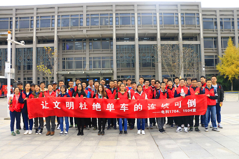 11月24日下午,物理与电子公司电科1504班、1704班联合开展了“文明出行,你我约定”的主题团日活动,针对共享单车问题,在新校区内以疏、堵结合的方式开阵了一场“共享整治”行动,倡导大家“停好共享车,畅通上学路”,号召全体同学自觉停放共享车,自发维护校园交通秩序,向不文明行为说“不”!活动中。