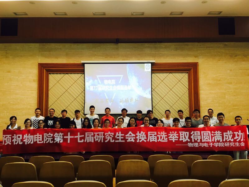2017年9月16日上午8:30,物理与电子学第十七届研究生会换届选举大会在物理楼116报告厅隆重召开。研究生辅导员胡菁菁老师,第十六届研究生会成员及2017级全体研究生新生参加了会议。会议由原研究生会副主席王力主持。