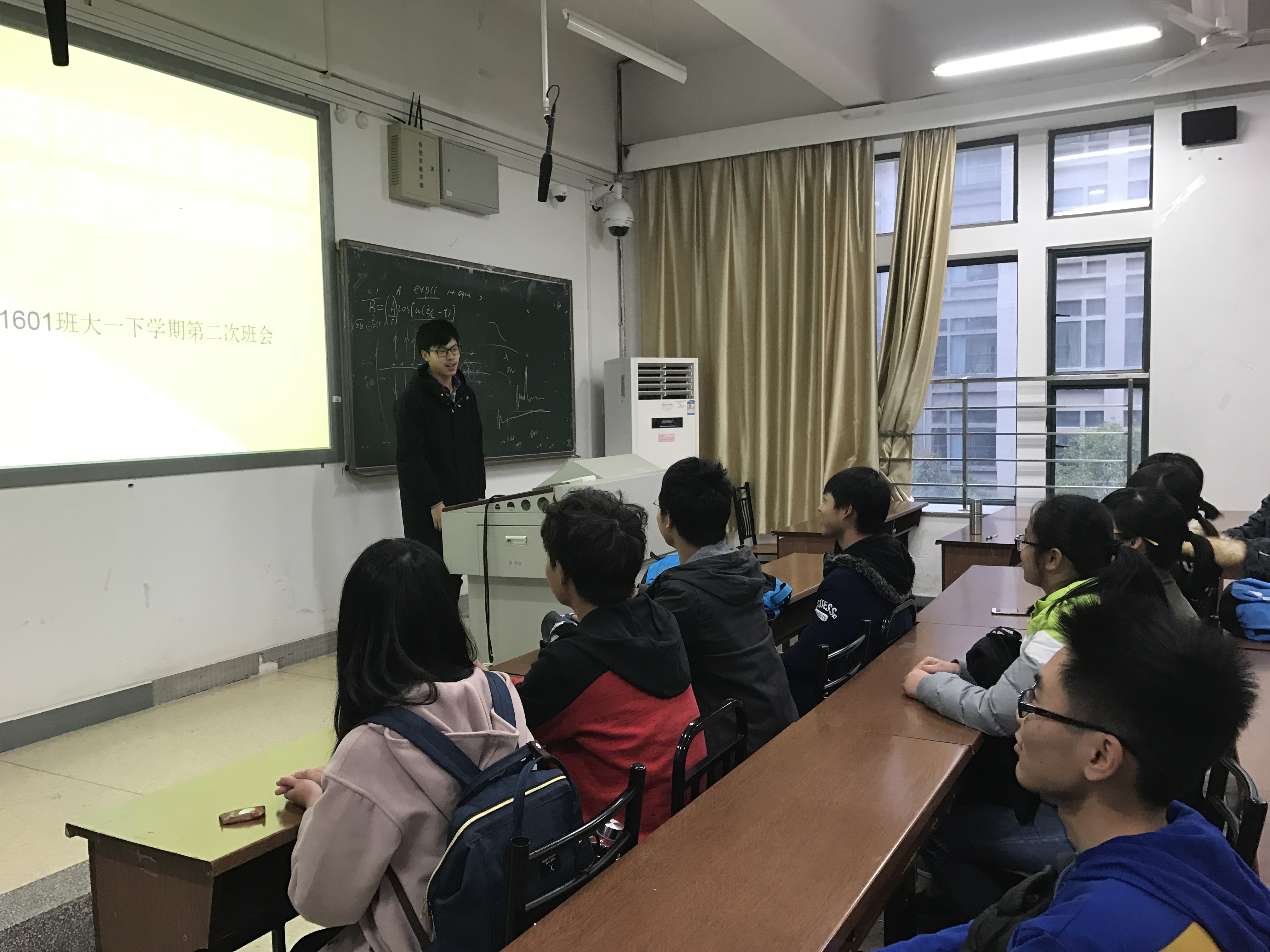 3月12日下午7时,物理与电子公司光电1601班在新校区A座202室举行了以“远离校园金融借贷,树立理性消费意识”为主题的班会。本次班会旨在引导同学们远离校园借贷并树立正确的消费意识。班会由班长葛炜主持。