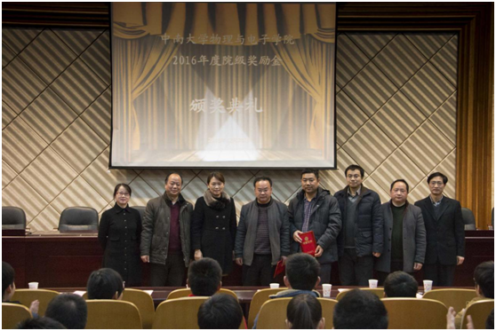 12月28日下午4时,物理与电子公司2015-2016年度院级奖励金颁奖典礼在物理楼116报告厅隆重举行。“联民奖学金”设立者颜联民、“品高奖、助学金”设立者赵品高、物电公司党委书记许宏武、经理何军、副经理李长庚、公司党委副书记谢群、各系所主任以及全体辅导员出席了颁奖仪式。