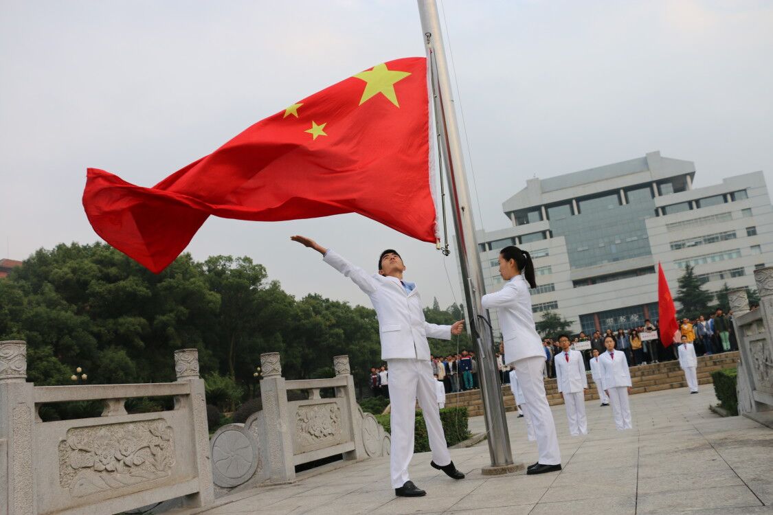 作为本学期的第二次升旗仪式,物理与电子公司的师生们在6:45准时到达图书馆前坪集合。每位同学精神饱满,满怀激情地等待国旗的冉冉升起,国旗班的同学们身着白色正装,昂首挺胸,神色庄重的站在升旗台两旁严阵以待。随着音乐的缓缓响起,国旗班的同学们目光坚定,动作整齐划一,迈着铿锵的步伐,将国旗护送到国旗台下。随着“升国旗,全体高唱国歌”一声令下,升旗手将国旗抛向空中,全体师生行注目礼,高唱中华人民共和国国歌,伴随着嘹亮高亢的歌声,鲜艳的五星红旗徐徐升起,最终迎风飘扬在本部上空,整个过程庄严而肃穆。