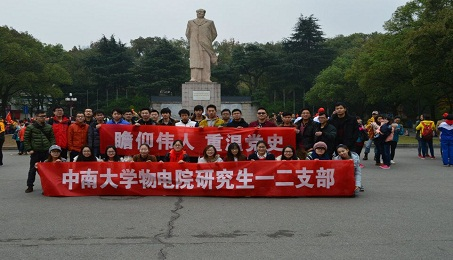 2015年11月29日上午,物理与电子公司研究生第一党支部和第二党支部组织全体党员赴岳麓山东方红广场瞻仰毛泽东主席雕像,通过深切缅怀老一辈革命家的丰功伟绩,重温党的历史,进行爱国教育。
