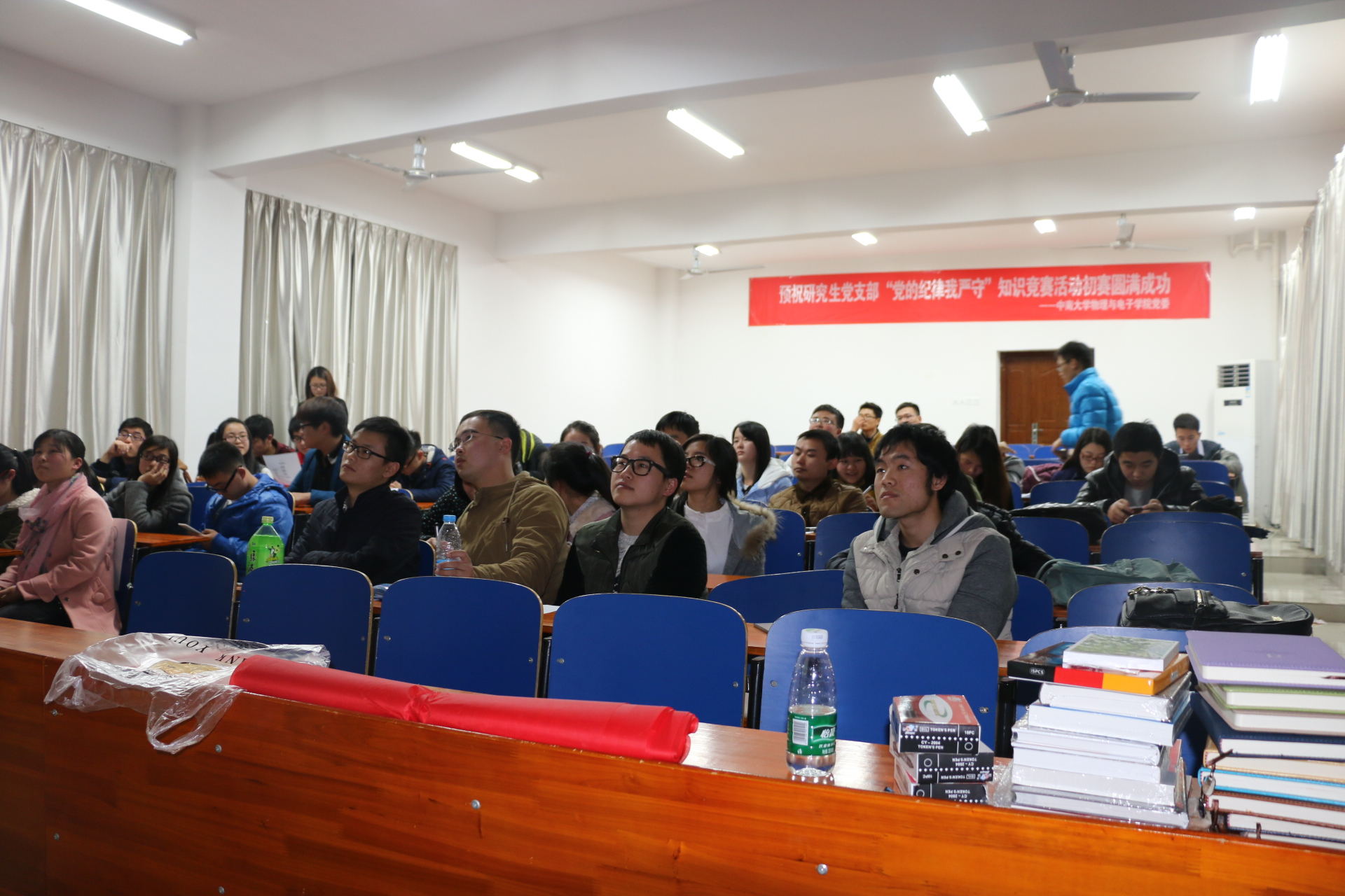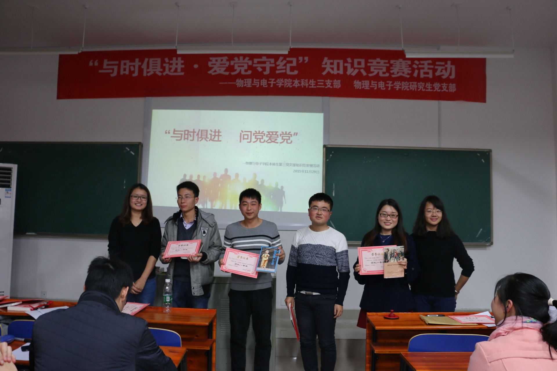 11月29日下午14时30分,物理与电子公司本科生三支部和研究生三支部联合举办的“与时俱进·爱党守纪”知识竞赛活动在物理楼124教室拉开帷幕。研究生党支部书记胡菁菁,本科生三支部书记邬永嘉和支部全体成员参与了此次活动。