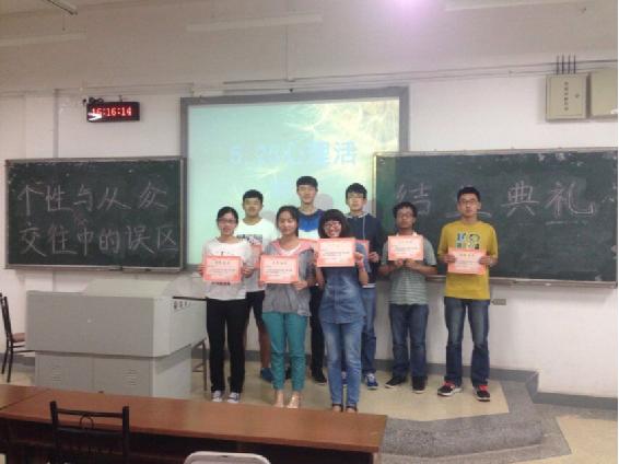 此次活动选取了大学人际交往中的三个方面:交际礼仪、人际交往的误区和个性与从众,分别由大一各班心理委员分组进行讲授与展示,最后由大三的特邀嘉宾倪立发同学主持结业典礼并为为优秀的心理委员们颁发荣誉证书。