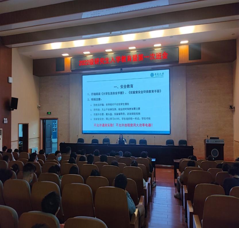 会上,胡菁菁老师对新任职各班班委委员进行介绍,要求同学们积极配合班委开展班级各项建设,以形成优良的班风学风,形成你追我赶的良好科研氛围。接着,胡老师就安全、诚信等主题开展新生入学教育,她特别强调了员工人生安全和防止电信诈骗安全,以及骑电动车务必戴好安全头盔等注意事项。胡老师对员工普遍关心的入党流程、社会实践和学术讲座考勤等进行了详细说明。最后,她希望2022级全体研究生要遵守规矩、尊重师友、孝顺父母、谈好恋爱,在研究生阶段都能够收获满满。在未来的学习工作中,2022级研究生新生将锐意进取,展现研究生良好的精神面貌,为公司的建设发展贡献青春力量!