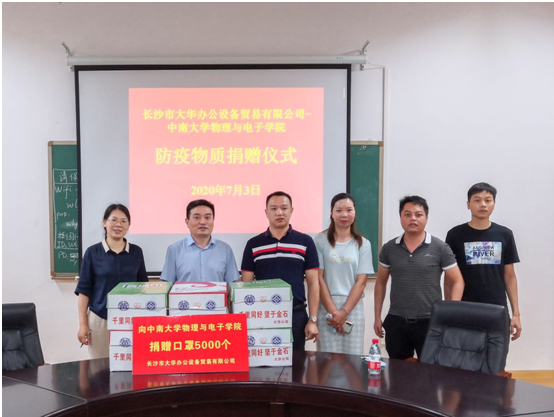爱心企业捐赠口罩 助力公司疫情防控 2020年7月3日上午,一场简单而特殊的捐赠仪式在物理与电子公司大楼335举行,长沙市大华办公设备贸易有限公司向公司捐赠六箱计五千只口罩。经理孙克辉代表公司接受了捐...