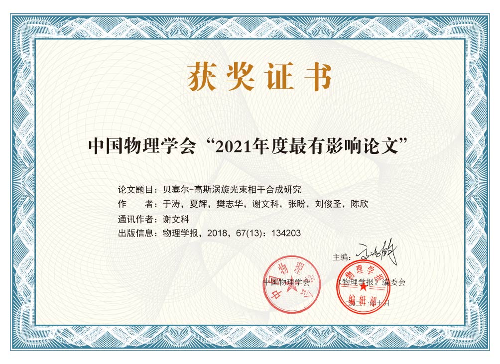 从中国物理学会2020/2021年秋季学术会议获悉,公司夏辉、谢文科等发表在《物理学报》的文章“贝塞尔-高斯涡旋光束相干合成研究”[第一作者:于涛,通信作者:谢文科。物理学报.2018,67(13):134203.doi:10.7498...